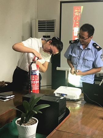 圖為員工實(shí)踐學(xué)習(xí)滅火器使用方法
