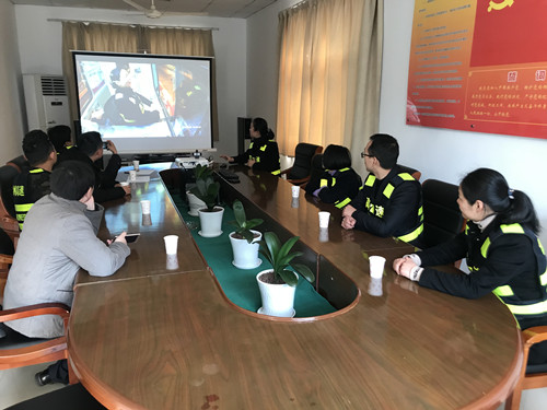 圖為考察小組人員在會議室觀看文明服務錄像