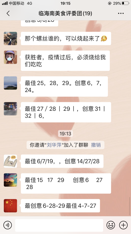 圖為評委團評選 本次活動共32幅作品進行參評,最終評選出朱英英的《鳳尾蝦球》、謝海云的《饞嘴螺絲》、李菊麗的《昂翔展翅》、陳瑩的《骨色骨香》為“最佳作品”,朱英英的《孔雀開屏》、葉懿慧的《向陽花》、吳琴琴的《秋收》為“最有創意作品”。大家紛紛相約疫情過后,以廚會友、以食為樂,來一場百家宴一飽口福。 陳瑩