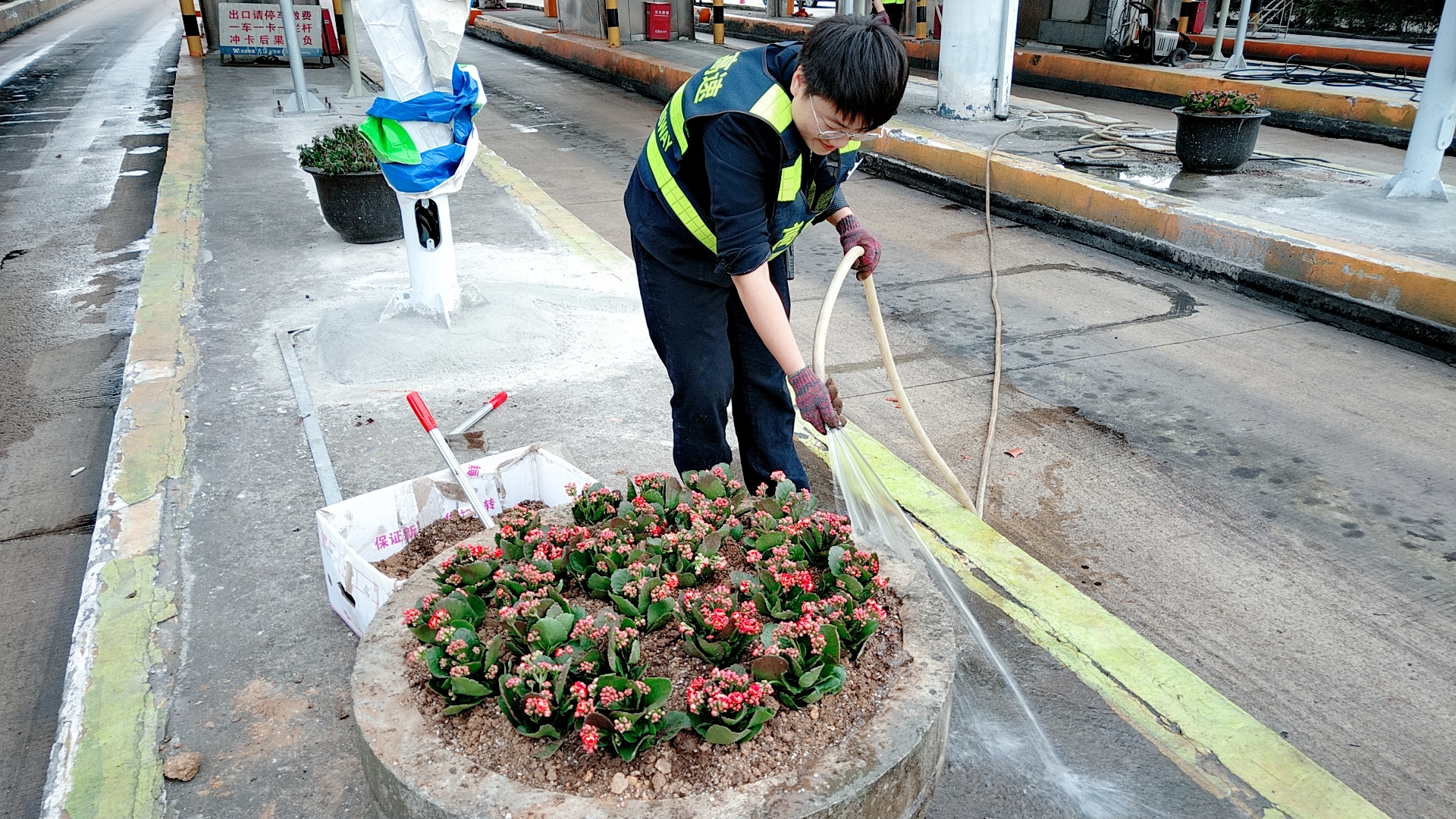 圖為栽種現場 現場,志愿者們身穿反光背心,拿著鋤頭、鐵鍬、水桶,帶著事先買來的小花苗,來到收費區域的島頭開始栽花活動。所領導班子成員身體力行,帶領大家投入到緊張的勞動中。大家挽起衣袖,不怕臟、不怕累,有的松土、有的種花、有的填土,有的澆水……有序地將一棵棵花苗栽進土壤。 通過大家的共同努力,經過近4個小時的時間,400棵樹苗被栽進了20多個大花盆中,美化了整個車道環境。 此次栽花活動增強了大家的生態環保意識和綠化意識,大家紛紛表示添花更要護花,要將綠化活動意識長期付諸實踐,共同建設美麗溫嶺西收費站。 鄭霞霞