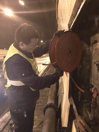 圖為檢查人員在檢查消防卷盤 大溪嶺隧道所負責人向來客介紹,隧道清洗工作需集團下屬的施救中心、維養(yǎng)中心、隧道所員工,以及外協(xié)單位、養(yǎng)護公司等人員的積極配合,分工合作,將利用兩天時間完成大溪嶺雙向隧道的清洗維修任務(wù)。張金財再次稱贊表示,控制隧道清洗時間能有效地緩解地方交通壓力、節(jié)能減排。 2018年度春運即將開始,各方檢查人員借此次隧道清洗機會,全面排查影響隧道暢通的安全隱患,做好隧道內(nèi)設(shè)備設(shè)施的維修保養(yǎng)工作,為創(chuàng)造平安節(jié)日提供保障。 陳智慧