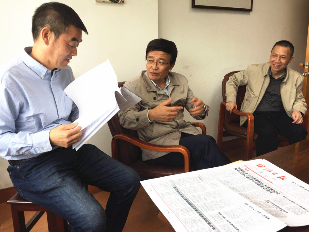 圖為市國(guó)資委主任徐豪和集團(tuán)總經(jīng)理張建平一起走訪市財(cái)政局股東單位