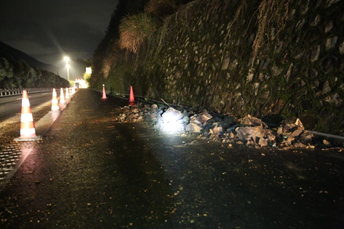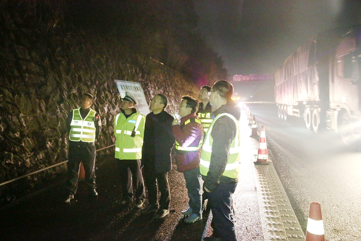 圖為碎石掉落現場 張建平與高速交警、施工單位等相關人員仔細勘踏險情現場,連夜會商制定解決高邊坡落石臺上的巨石方案。由于深夜天黑,高邊坡坡度較高,沒有直接供人上坡的道路,夜間施工存在較大困難且易造成人身危險,只能安排人員緊盯現場通宵觀察情況,隨時匯報險情進展,等天一亮立即清理二級平臺上的大落石。張建平特別叮囑相關部門負責人,近期雨水還將持續一段時間,容易造成塌方等自然災害的發生,一定要組織人員再次對高速全線高邊坡開展隱患大排查。 天亮后,工程部即聯合相關人員共清理了5立方落石,并對硬路肩進行臨時圍擋,防止落石再次掉到車道上。8點25分,隧道恢復正常通行。