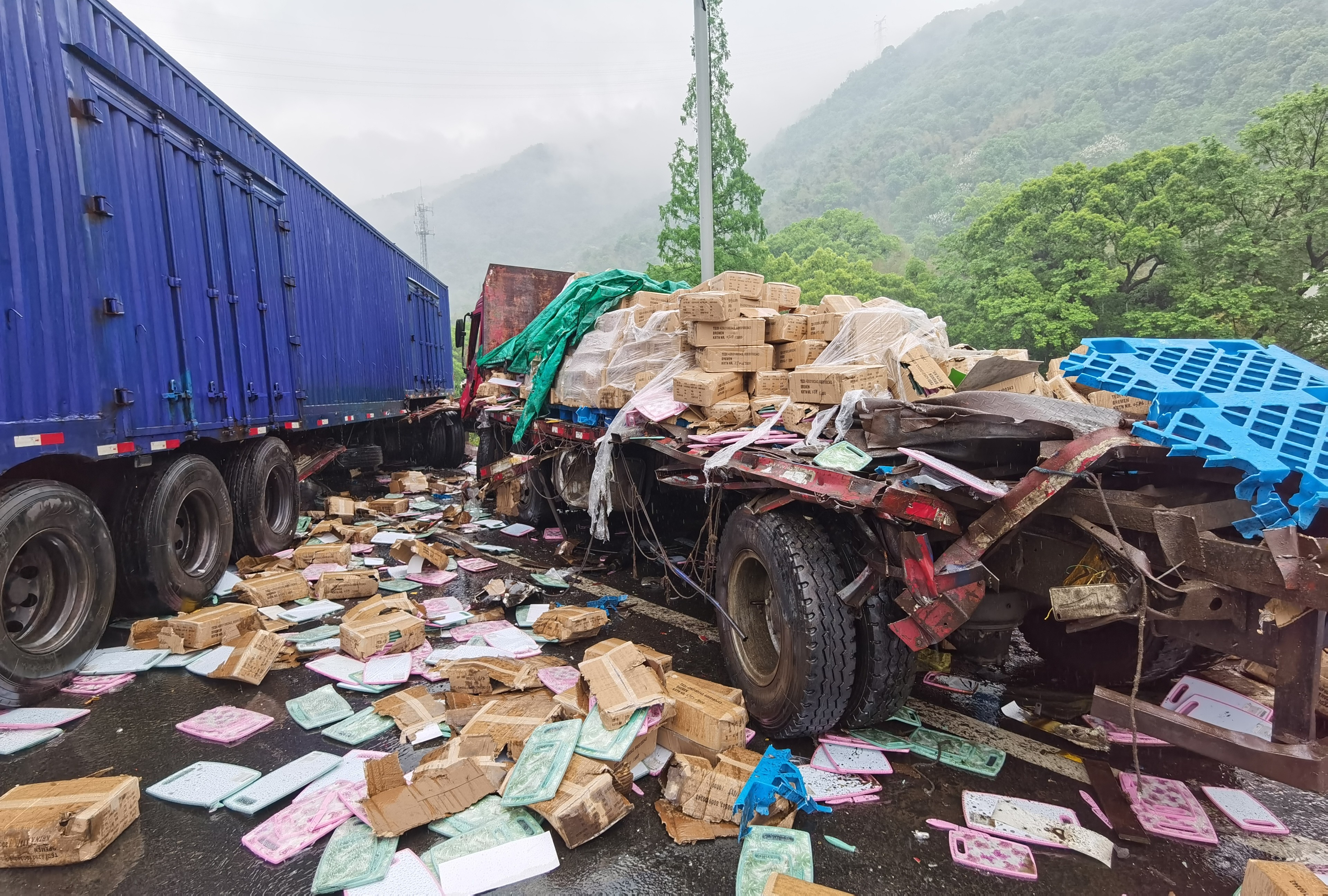 緊急救援!黃土嶺隧道口一輛大貨車避讓不及追尾后撞上護欄 4月13日上午8點30分左右,天突下大雨,黃土嶺隧道附近傳出一聲巨響,發生了驚魂一幕。 距離寧向洞口200米處,有一輛14米長的箱式大貨車避讓不及撞上了一輛平板小貨車,隨即又撞到隔離護欄,整個車頭瞬間被撞得七零八碎嚴重變形,車尾橫向路面且僅留小車能駕駛的空間。被追尾的平板貨車所載貨品散落一地,高速路上、護欄外一片狼藉,所幸無人員傷亡,大貨車司機膝蓋輕微撞傷。