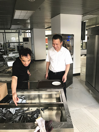 圖為公司副董事長、總經(jīng)理張建平于7月1日到大樓檢查指導食堂整改工作