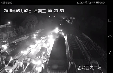 5月1日8:27分,黃土嶺隧道發生多起多車追尾現象,事故現場仿佛貪吃蛇,二車追尾、三車追尾、四車追尾,特別是四車追尾現場,除了追尾車輛車頭凹陷變形,被撞車輛車尾面目全非外,一輛白色SUV更是被后車頂到前引蓋上,3名司乘人員受傷。隧道所監控員洪慧雯不斷切換鏡頭,向指揮中心、醫院發出報告;早已到達的隧道所執勤隊已在現場維持秩序,引導后方車輛通行,為交警、急救和施救車輛開通生命通道;與此同時,臺州、臺州南和溫嶺西收費所暫時關閉寧向入口。