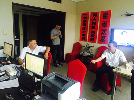 圖為集團副董事長、總經理張建平向股東耐心解釋稅收優惠政策 在三門收購點,遇到一位正猶豫不決的股東,張建平耐心地向他解釋了相關政策,直接明了地消除他內心顧慮,最后股東滿意地簽署了股權轉讓協議。 楊靜