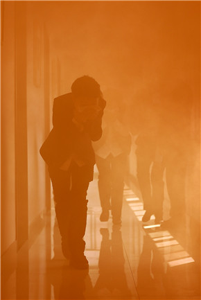 該演練模擬了生活樓發(fā)生火災(zāi),員工一發(fā)現(xiàn)火情就立即撥打了報警電話。參加演練人員聽到警報聲后,迅速拿起打濕的毛巾捂住口鼻,手扶墻體或樓梯扶手,俯身低姿從三樓或二樓,向安全通道有序撤離。全體人員不一會就疏散到了安全地帶,同時連接好消防水帶,迅速跑至火源附近,對準(zhǔn)火源有效滅火。