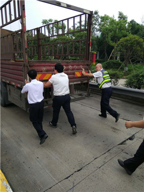 2018年5月27日,這本來是平凡普通的一天,可因為這件事,變成了不一樣的一天。 這一天,溫嶺西高速路收費員洪燈杰像往常一樣,在一號超寬車道旁的收費亭里工作。一輛綠色汽車剛走不久,卻發現后面一輛12軸型的小貨車停在那里,一動不動。洪燈杰心生疑惑,于是趕緊走出收費亭,到小貨車跟前查看。原來,這輛車剛走到收費站面前,便耗盡了電量,發動不了了。正在司機焦頭爛額之時,班長湯明漲和其他收費員吃飯回來,看見了這一幕。 湯明漲簡單地詢問了洪燈杰事情的經過,本來準備等拖車,可是現在正是中午車輛高峰期,加上五號車道在施工,等拖車不合適。如果導致一號車道堵車,切換成ETC也緩解不了??紤]到這些問題之后,湯班長決定叫來幾個“大力士”,幫忙推車。