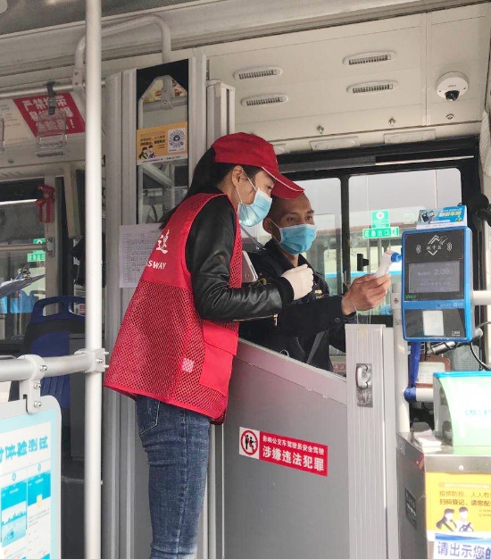 3月18日上午,臺州高速計財部職員毛譯聆早早就到站,一一戴好口罩、護目鏡、一次性手套,提前3分鐘走上所跟的108路班車。一路上,看見有乘客上車,她便等在車門前,量體溫、引導年輕人掃碼自行登記資料,幫助老年人實名登記身份信息,“安檢”通過后讓乘客有序上車,并禮貌勸導乘客間隔而坐,降低病毒感染的風險。