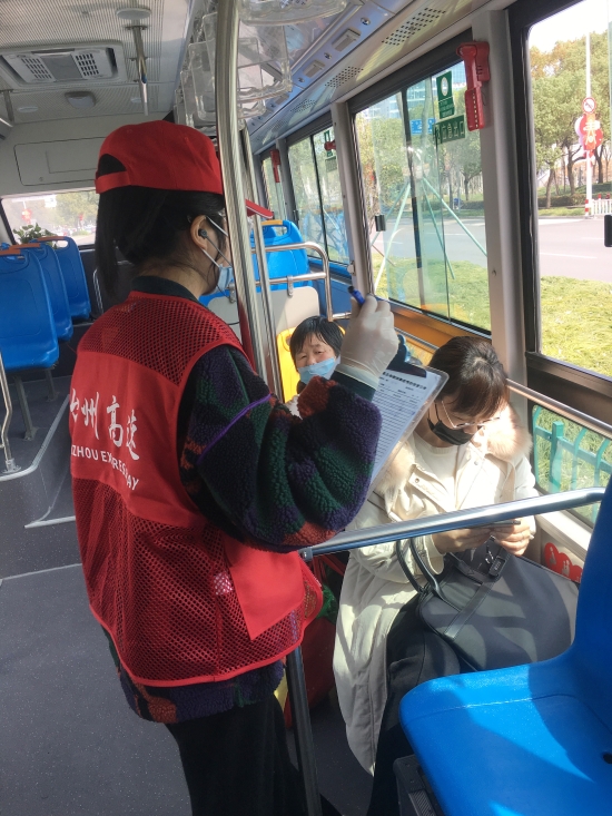 圖為志愿者跟車防疫服務 “我所在的一班車來回一趟是1個多小時,疫情期出行人員不多,大家上車前都會認真配合檢查。”毛譯聆說道,她一次連續跟車要3個多小時。 疫情在前,國企擔當,臺州高速人會持續共戰疫情,哪里有需要,挺身在哪里,以行動詮釋高速責任,展現高速風采。