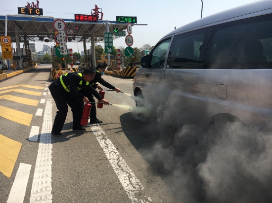圖為交通事故應(yīng)急演練 在收費(fèi)廣場(chǎng)交通事故應(yīng)急預(yù)案演練中,該所模擬了汽車(chē)在收費(fèi)車(chē)道起火的交通事故。事故發(fā)生后,當(dāng)班班長(zhǎng)第一時(shí)間啟動(dòng)預(yù)案,將險(xiǎn)情報(bào)告監(jiān)控員,并立即關(guān)閉事故車(chē)道,組織人員對(duì)起火點(diǎn)進(jìn)行前期壓制,同時(shí)指揮人員擺放標(biāo)志,引導(dǎo)后續(xù)車(chē)輛,并快速放行。接到險(xiǎn)情報(bào)告的所長(zhǎng)、辦公室人員迅速趕到現(xiàn)場(chǎng)參與救援:女同志協(xié)助班組開(kāi)足車(chē)道;部分男同志負(fù)責(zé)出入口車(chē)輛的疏導(dǎo)指揮工作;其余人員負(fù)責(zé)對(duì)火災(zāi)進(jìn)行撲滅……大家各司其職,快速處理險(xiǎn)情。
