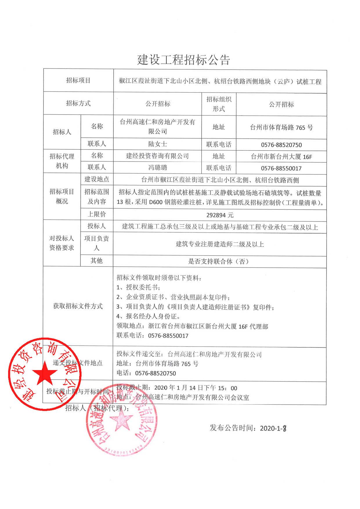 椒江區(qū)葭沚街道下北山小區(qū)北側(cè)、杭紹臺鐵路西側(cè)地塊(云廬)試樁工程招標(biāo)公告