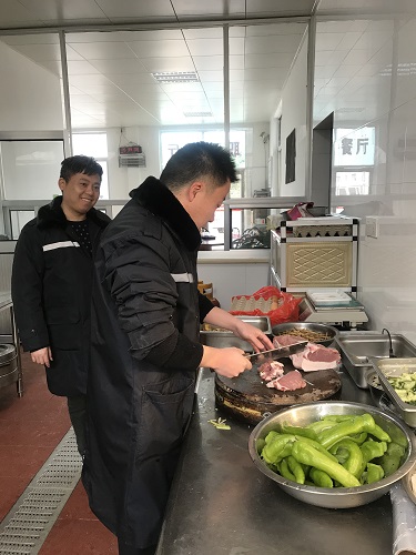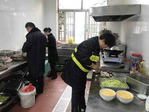 圖為工作人員幫忙做飯 臨近春節(jié)又正值春運期間,一時也找不到人員替代。為了保證員工正常用餐,中午,楊瑩瑩決定親自下廚為員工做飯,冰冷的水里直接洗菜,掄起廚刀剁肉切菜,卷起袖子熱鍋炒菜,儼然成為合格的大廚。副所長周超、杜佳自動加入司廚行列,其他行政人員在一旁配合摘菜、剝蒜等等,正在休息的班組其他人員見狀也紛紛前來幫忙。這一刻,小小廚房其樂融融,那是家的味道。午餐過后,楊瑩瑩又開始考慮晚餐和明天的早餐,但是她不再發(fā)愁,因為身后還有無數(shù)個他們。