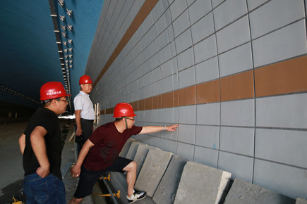 圖為檢查組在2#隧道內(nèi)檢查隧道瓷磚鋪貼情況